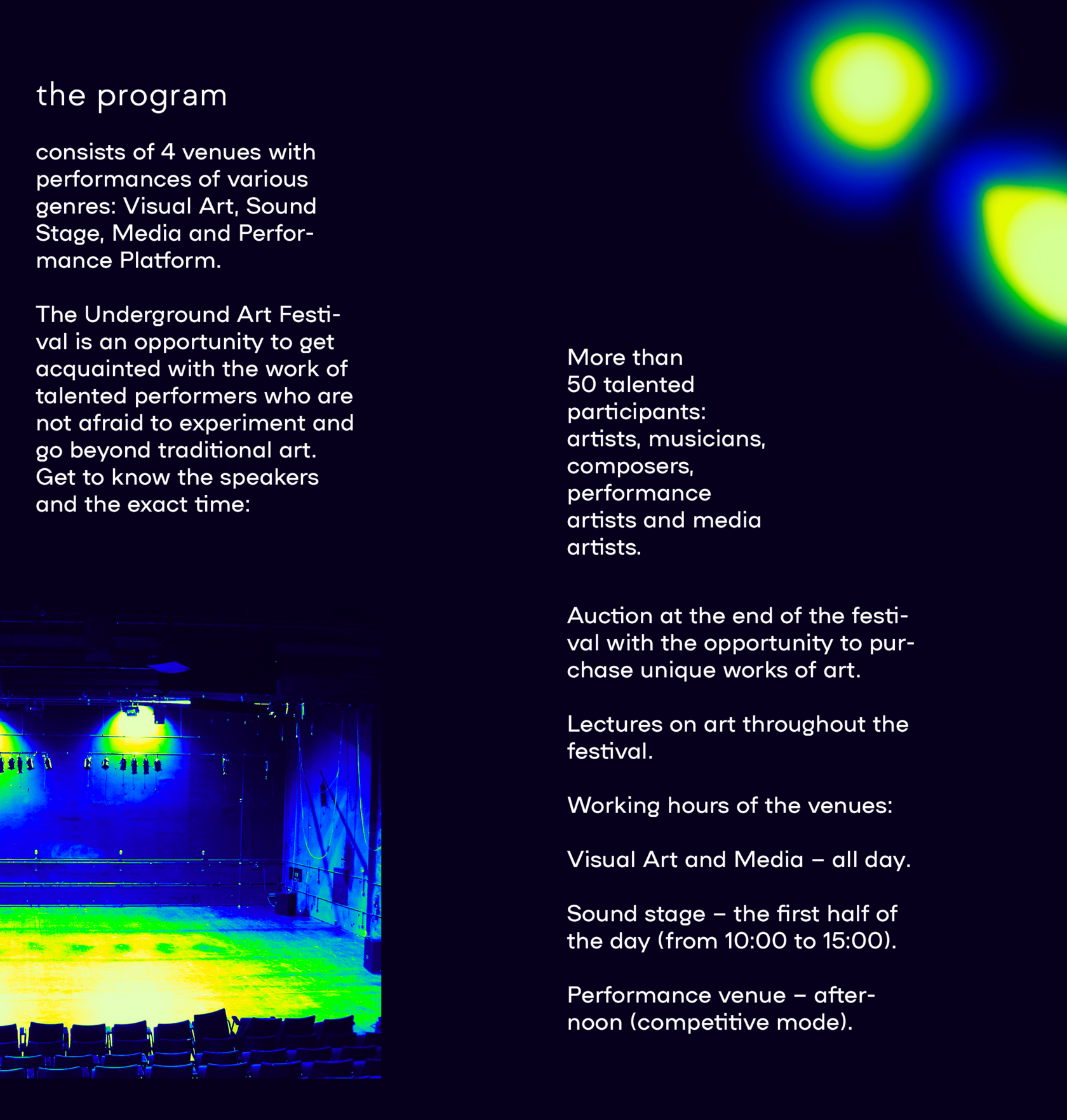This project is my visualization of what a festival could look like if I were to create it. It is filled with gradients, animations, and elements inspired by space, reflecting the core ideas I want to convey through art: changeability, depth, and brightness.